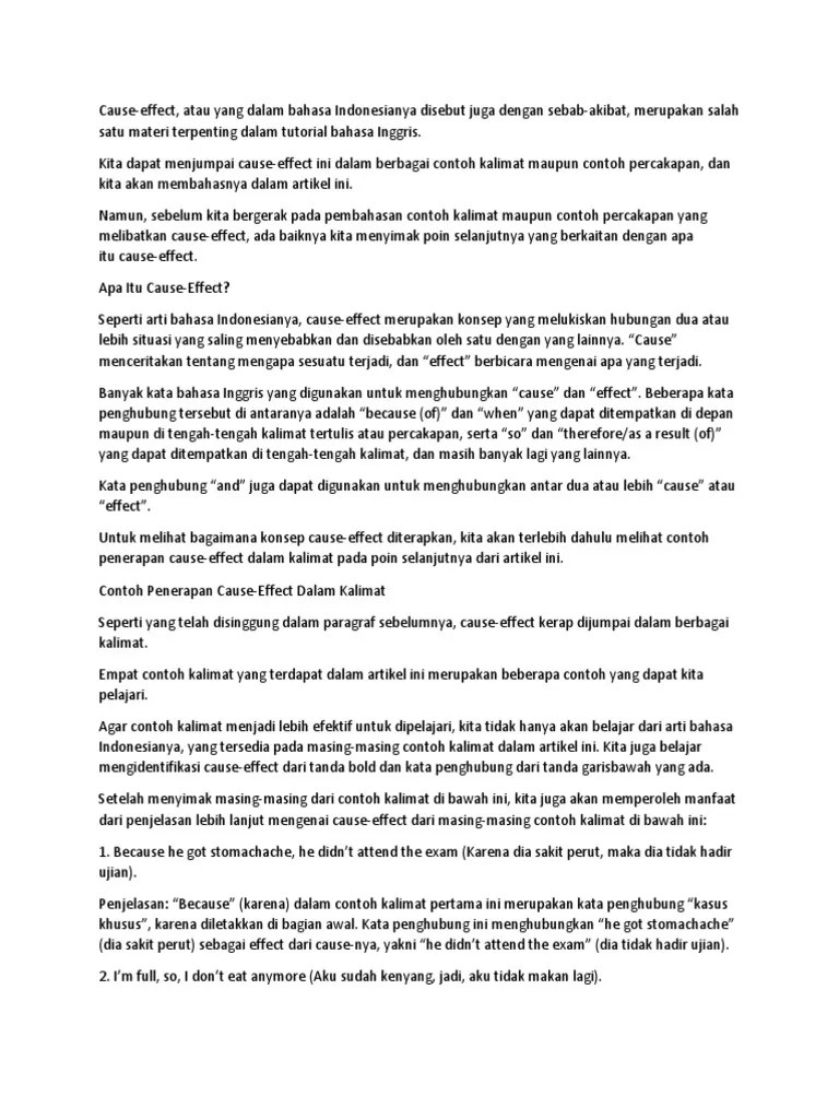Kesatuan berarti seluruh kalimat dalam paragraph membicarakansatu gagasan (gagasan. Contoh penggunaan due to dalam kalimat bahasa inggris. "john studied hard for the math exam. Untuk mengungkapkan sebab dan akibat dalam bahasa inggris, kamu bisa menggunakan kata dan frasa tertentu . Cause and effect merupakan hubungan sebab akibat. Dalam bahasa inggris kalimat sebab akibat berarti cause and effect sentence, yaitu kalimat penyebab dari suatu peristiwa hingga menimbulkan . Bahwa, ketika, sebelum, karena, asal, . Sebagai contoh, gunakan "therefore" untuk menunjukkan hubungan sebab akibat antara dua kalimat: Menulis dan berbicara dalam bahasa inggris tentang sebab akibat ini disebut cause. Contoh paragraf sebab akibat dalam bahasa inggris. Modus participe, seperti kalimat (6). Contoh kalimat cause and effect. Kata yang dicetak tebal adalah contoh dari kata hubung yang dapat digunakan dalam menyatakan sebab dan akibat.