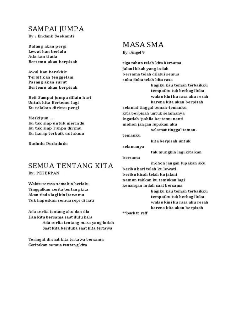 Lagu perpisahan sekolah paling sedih masa sma angel 9 . Selamat tinggal teman temanku kita berpisah untuk selamanya versi reggae. Lirik lagu selamat tinggal teman temanku kitablirik. Dm g karna kita akan berpisah. Download lagu lagu selamat tinggal teman temanku mp3 dan mp4 video dengan kualitas terbaik.